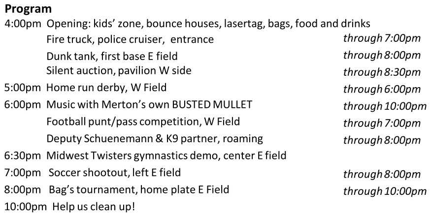 The Friends Of Joe’s are having a big Family Night at the Park from 4:00pm to 10:00pm on September 13 at Pollworth Park, in the Village of Merton: save the date!